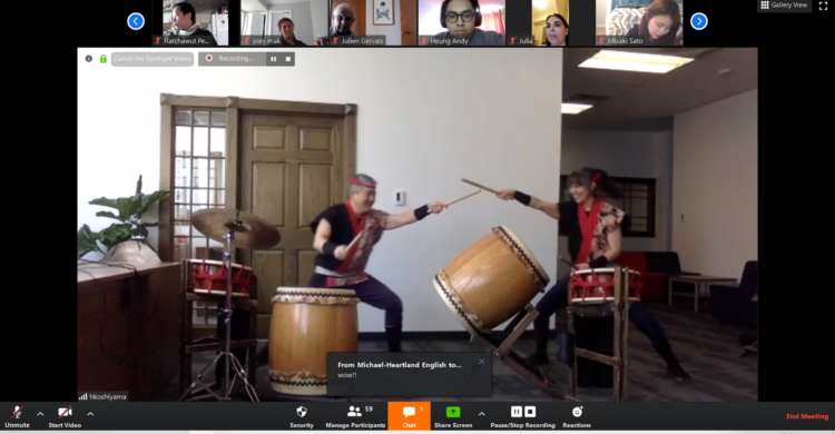 Heartland students, staff and friends all had the extreme pleasure of enjoying a Fubuki Daiko performance Friday, April 17, as part of the Heartland Online Activities programming. The high energy duo played an incredible set of traditional Japanese Taiko songs for over 60 participants online. They also answered several questions from the audience as students were very interested in the history of Fubuki Daiko and their connection to Winnipeg. The group (normally consisting of 4 members) has been together for many years and typically performs around the city during festivals like Folklorama and at the Main Stage Cube in the Exchange District during the Fringe Festival. They have also traveled to many countries to share their music. Thank you Fubuki Daiko!